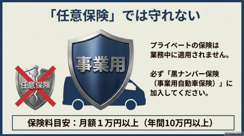 - 総コストの計算月額の車両代だけでなく、月額4万円前後かかる可能性のある「任意保険料(対物1億円以上)」を必ず合算して事業計画を立てること。