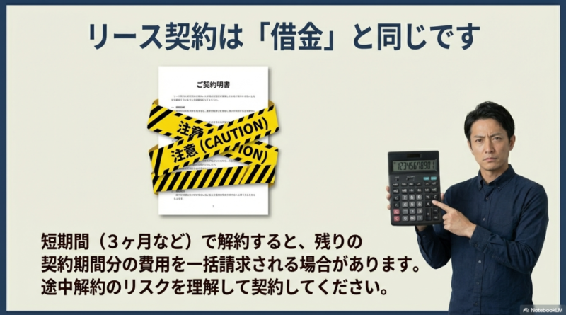- 解約不可 : 一般的なレンタカーのように「明日返す」ことはできず、中途解約すると契約残期間のリース料総額など、高額な違約金が発生します。