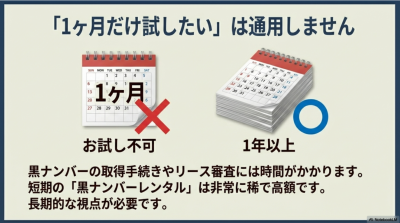 このため、一般的なレンタカーのように「試しに1日だけ」といった使い方はできず、実質的には事業用の設備を導入する「リース契約」として、慎重に検討する必要があります。
