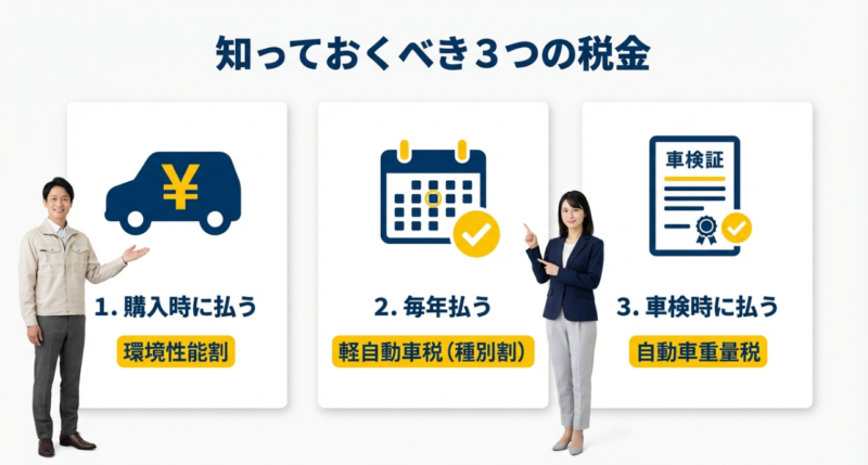 まずは「何に、いつ、いくら払うのか」をスッキリ整理します。  軽貨物車の税金は、毎年払うもの・車検時にまとめて払うもの・購入時だけかかるものに分かれます。  ここを押さえるだけで、見積もりの見方も、買い替えの判断も一気にラクになりますよ。