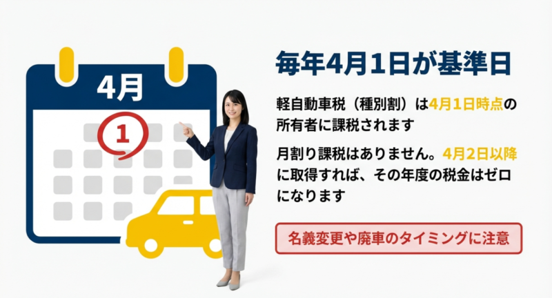 意外と見落としがちなのが「登録日」です。  たとえば4月2日以降に新規登録した場合、初年度の軽自動車税(種別割)が課税されないケースがあります(自治体の運用によって見え方が違うこともあるので要確認)。  この差は一回だけの話ですが、導入コストが気になる人には地味にうれしいポイントですよね。