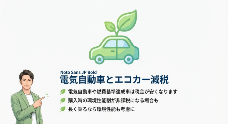 エコカー減税は主に重量税に効く軽減策で、燃費基準の達成度合いによって免税や軽減が決まります。  ここは今後も基準が見直されやすいところで、「前は対象だったのに次は違う」みたいなことが起きやすいです。  つまり、購入時点の情報だけで判断すると、次の車検で「思ったより重量税が高い」になりやすいんですよ。