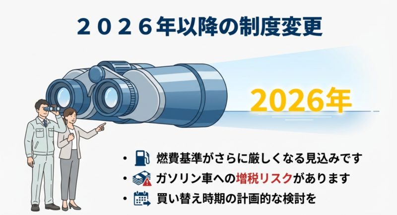 2026年以降の税制改正は、購入時の負担や環境対応の方向性が変わる可能性があるので、「今の制度がずっと続く前提」で計画しないほうが安全です。  私は、税金だけで決めずに、保険・メンテ・稼働停止リスクまで含めて、トータルで月割り・年割りで見て判断するのが現実的だと思います。