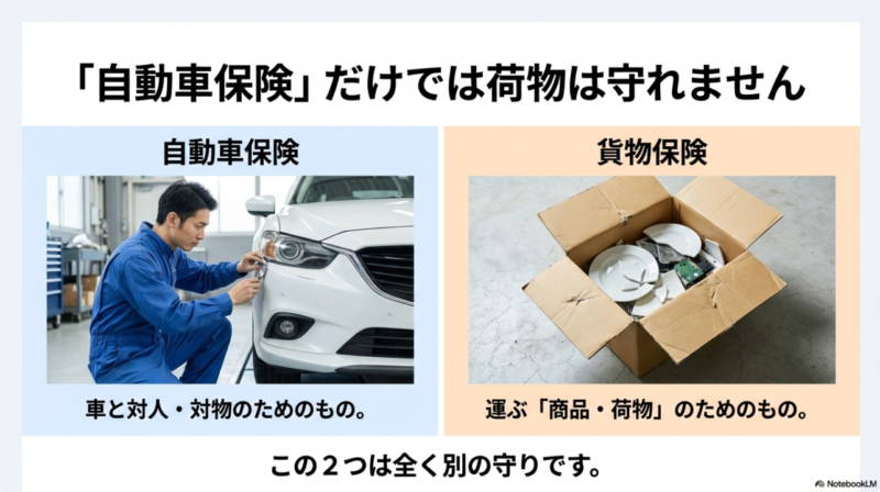 事故の賠償(対人・対物)=任意保険、荷物の賠償=貨物保険。この線引きができると、必要な保険が見えてきます。