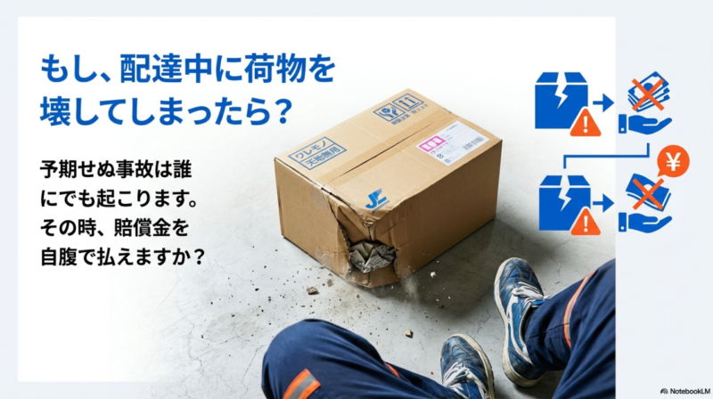 貨物賠償責任保険(いわゆる貨物保険)は、預かった荷物を破損・紛失させたときの法律上の賠償責任に備えるものです。 任意保険(自動車保険)とは守る対象が違うので、ここが混ざると「入ってるつもりだったのに出ない」になりやすいです。 軽貨物で一番ありがちな事故って、ぶつけるだけじゃなく、荷物を落とす、濡らす、潰す、積み方で傷める…みたいな“配送ならでは”の損害なんですよ。