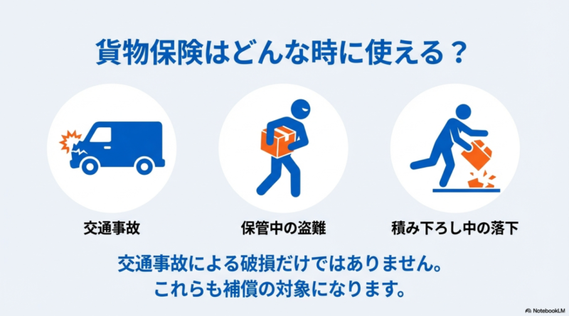 貨物保険は、たとえば配送中の事故で荷物が壊れた、荷下ろし時に落としてしまった、火災や盗難で失った、などの「運送中の損害」を中心に設計されます。 ただ、すべての損害が無条件に出るわけではなく、梱包不備や貨物固有の性質、置き忘れなど、免責に該当するケースもあります。 だから私は、加入前に「どんな荷物を、どんな流れで、どんな場所に置くか」を先に棚卸しするのが大事だと思っています。