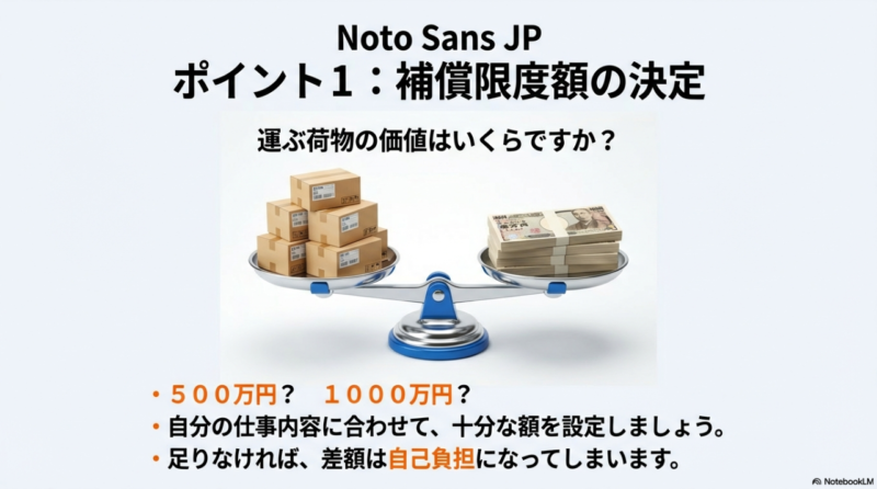 補償設計で特に大事なのは、1事故あたりの補償限度額と、免責金額(自己負担)の設定です。 高額品を扱うなら上限を上げる必要が出ますし、日用品中心なら必要以上に盛ると固定費が重くなります。 ここで私は「単価×最大同時量」を目安に考えます。 たとえば、1個1万円の荷物を20個積む可能性があるなら、単純計算で20万円相当が“同時に飛ぶ”リスクがある、みたいな感じです。 実際は同時に全部損害にならないケースもありますが、考える入口としては十分役に立ちます。