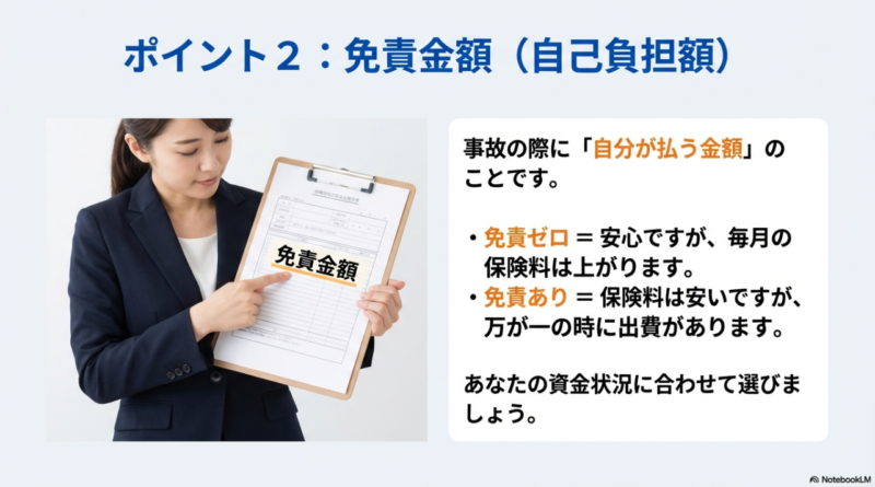 ただし、免責を上げすぎると「いざという時に結局払えない」も起きます。 自分が即時に払える上限を冷静に決めてから調整するのが安全です。 最終的には、保険会社の説明と約款を確認しながら、あなたのキャッシュフローに合う形に落とし込んでください。
