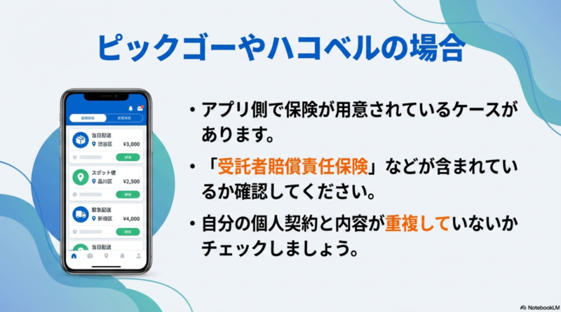 プラットフォームの補償があると安心に見えますが、あなた自身の任意保険・貨物保険が不要になるとは限りません。 重複や不足が起きないように、全体で設計するのがコツです。