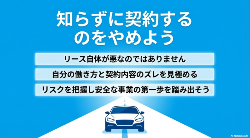 あなたが契約前に見るべきなのは、月額、総額、距離制限、保険、解約条件、返却条件、黒ナンバー対応、そして自分の継続可能性です。 この8つを見れば、かなり判断しやすくなります。 なお、法令、保険、税金、契約条件は変更や個別差があります。 正確な情報は公式サイトをご確認ください。 最終的な判断は行政書士、保険代理店、契約先担当者などの専門家にご相談ください。