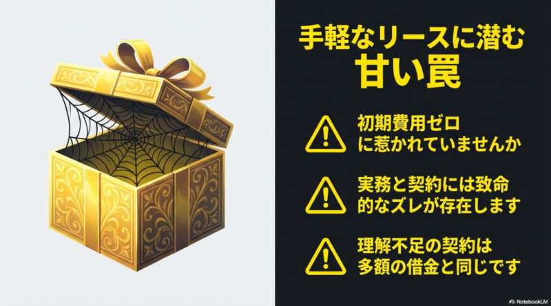 特に注意したいのは出口戦略です。 購入なら売却で資金回収しやすいですが、リースは返却して終わりではなく、解約精算が重くのしかかることがあります。 契約前に、解約条件、違約金、残債の扱い、返却時の精算ルールは必ず確認してください。