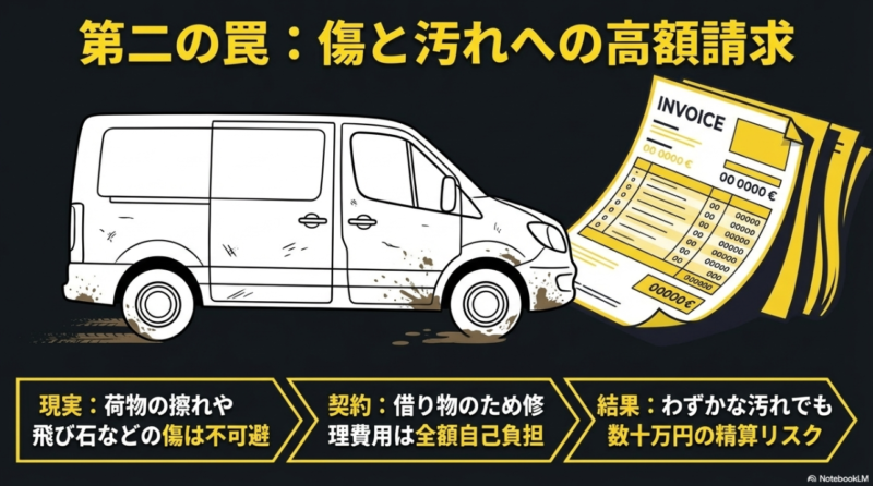 原状回復と残価精算は、契約時より返却時に効いてくる論点です。 荷室を使う軽貨物では、内装の擦れや荷物の出し入れによる傷、飛び石、バンパーの小傷などが起こりやすく、返却時に修繕費として請求されることがあります。 ここ、軽貨物では特に現実的な問題です。 乗用車のように丁寧に使っていても、仕事で毎日使う以上、完全に無傷で返すのはかなり難しいです。