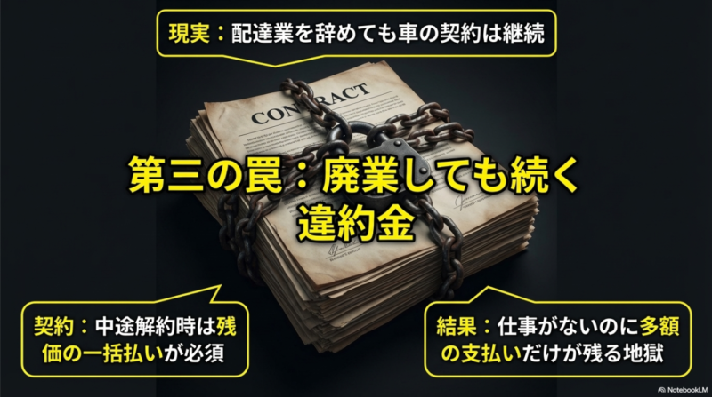 契約書では原則中途解約不可、または解約時に残期間分の費用相当額や違約金が発生する形が珍しくありません。 もし開業後に案件が思ったほど安定しなかったり、家庭の事情で稼働を減らさざるを得なかったり、体を壊して休業が必要になったりすると、車を使えないのに支払いだけ残る状態になりがちです。 これは精神的にもかなりきついですし、資金繰りを一気に悪化させる原因になります。