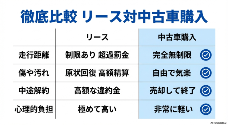 中古車購入との違いを比較すると、リースの見え方がかなり変わります。 購入は最初にまとまった資金が必要ですが、その後は月々の支払い負担を抑えやすく、売却という出口もあります。 軽貨物のように走行距離が伸びやすい働き方では、この自由度はかなり大きいです。 ここ、数字で見ると納得しやすいですよ。 初期費用だけ見ると購入は重そうに感じますが、事業を2年、3年、5年と続けたときの累積コストや資産性まで入れると、印象はだいぶ変わります。